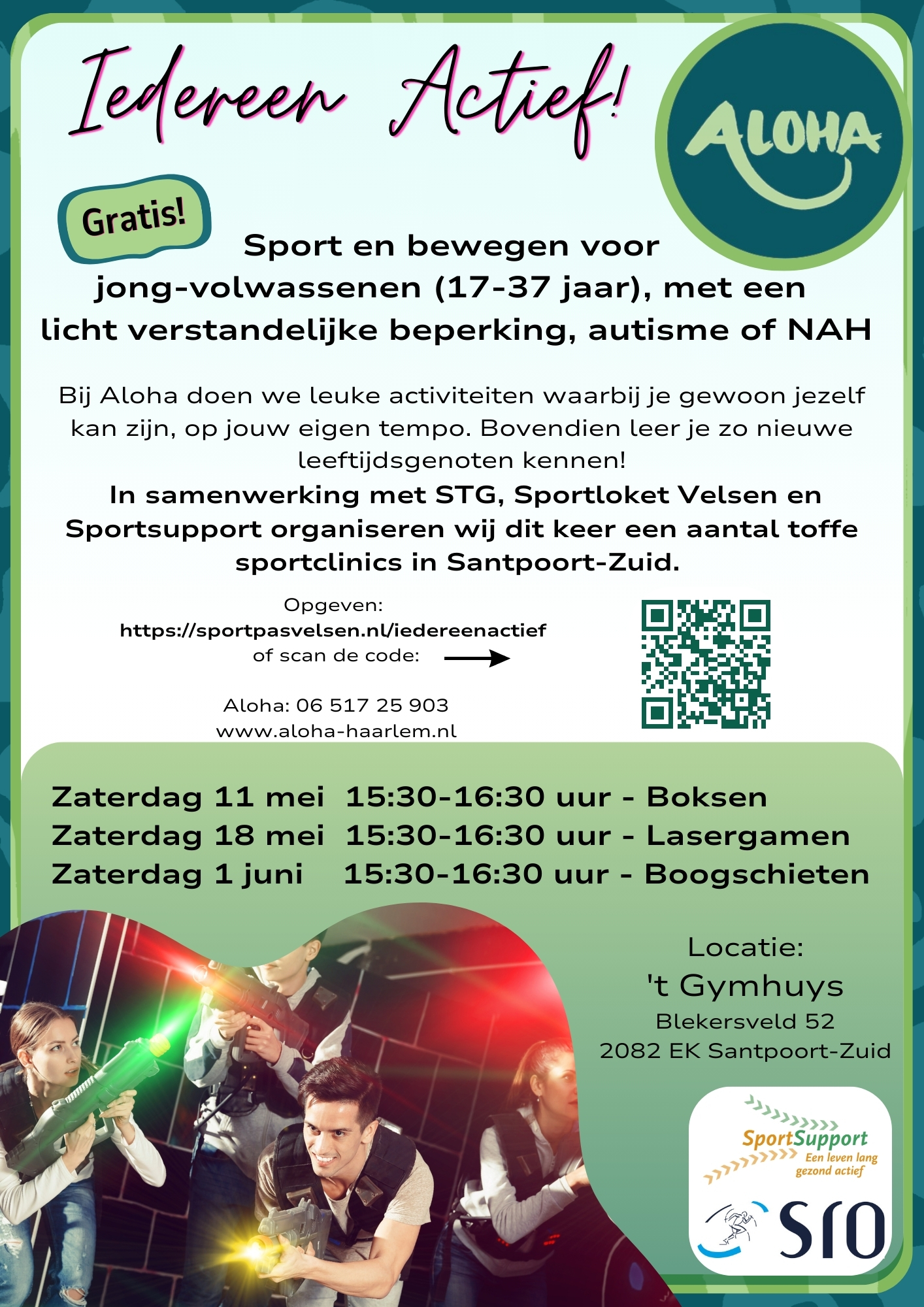't Gymhuys Blekersveld 52, Santpoort-ZuidZaterdagmiddagen saai? Welnee! We gaan toffe sporten doen in Santpoort-Zuid! Boksen, Lasergamen en Boogschieten. Ik denk dat we een hoop lol gaan hebben met elkaar! Kom jij ook?
