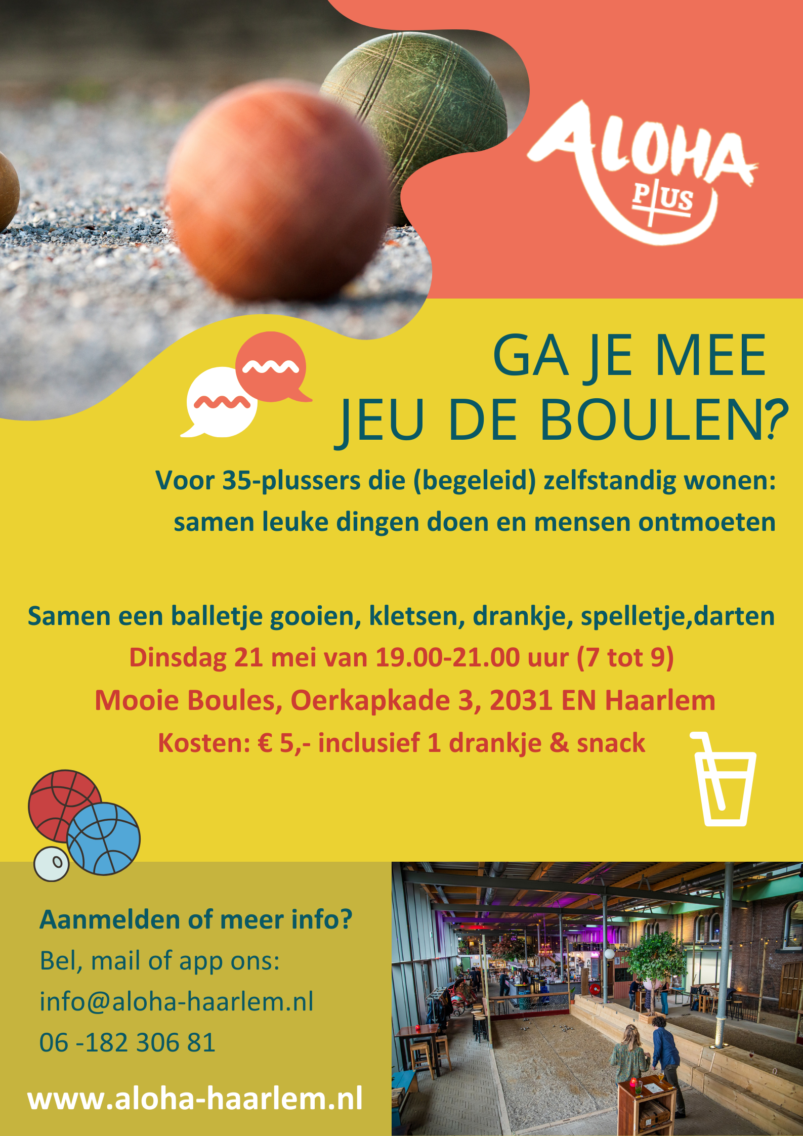 Mooie Boules Oerkapkade 3, HaarlemIedereen kan jeu de boulen! Samen gooien we een balletje. We drinken samen wat en je kunt er ook spelletjes doen of darten. Kom je ook?