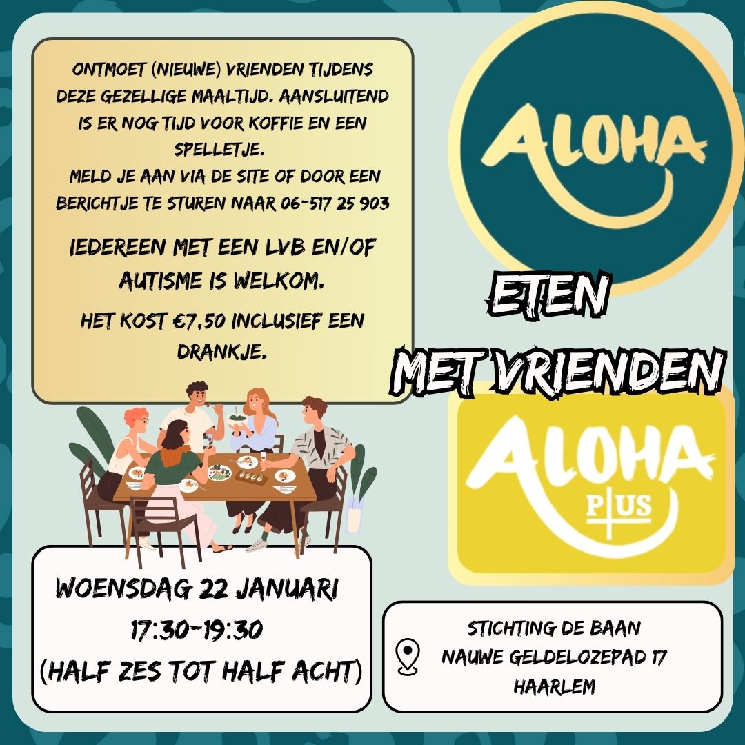 De Baan Nauwe Geldelozepad, Haarlem, Noord-Holland, NederlandBij Aloha organiseren we elke woensdagavond een gezellige activiteit onder de naam Vriendschap en Vrije Tijd! Of je nu zin hebt in een creatieve workshop, een spelletjesavond, een sportieve uitdaging of gewoon een fijne avond samen – er is altijd iets leuks te doen. Elke week staat er een andere activiteit op het programma, zodat er voor iedereen iets bij zit.