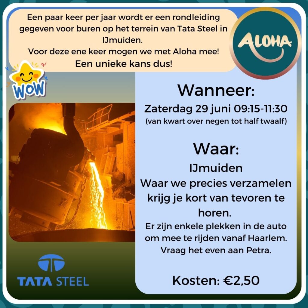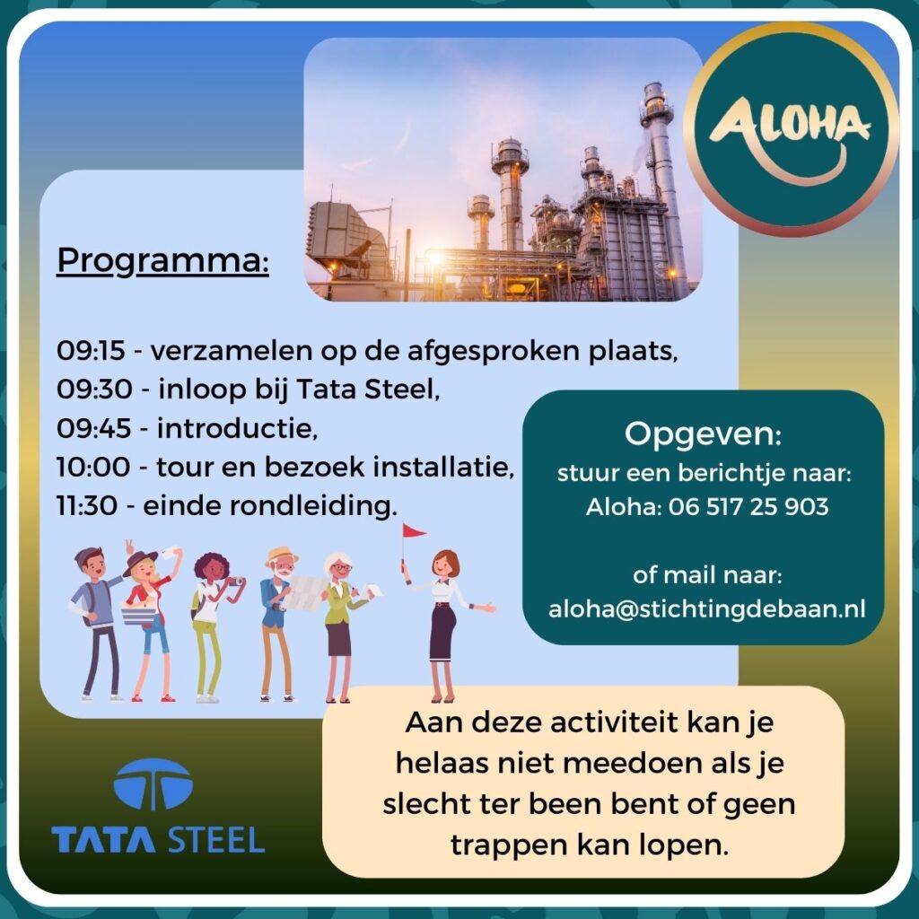 « Alle Evenementen Dit evenement is voorbij. Rondleiding Tata Steel in IJmuiden. 29 juni, 2024 @ 09:15 €2,50 « Aloha chill-avond 🍹 Rondleiding in het Museum van de Geest (Dolhuys) » Toevoegen aan kalender Google Calendar iCalendar Outlook 365 Outlook Live Gegevens Datum: 29 juni, 2024 Tijd: 09:15 - 11:30 Kosten: €2,50 Evenement Categorieën: actief, avontuur, Gezellig samen Locatie Tata Steel IJmuiden, + Google Maps
