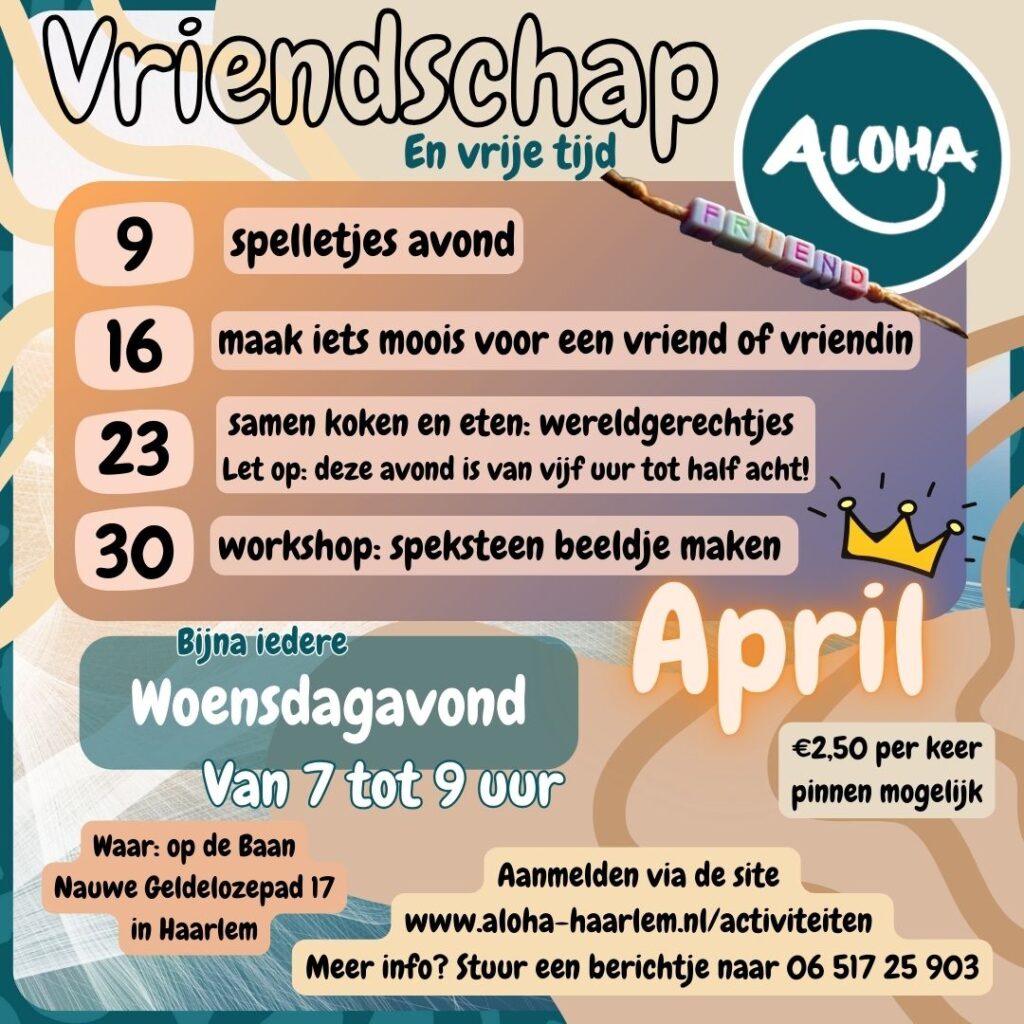 « Alle Evenementen Dit evenement is voorbij. Vriendschapsavond ➡️ Workshop Speksteen Bewerken 30 april, 2025 @ 19:00 €2,50 « Selena’s wereldgerechtjes! Samen koken en eten 😋🍜 🦋Vriendschaps-avond✨ » Toevoegen aan kalender Google Calendar iCalendar Outlook 365 Outlook Live Gegevens Datum: 30 april, 2025 Tijd: 19:00 - 21:00 Kosten: €2,50 Evenement Categorieën: Binnen, creatief, Gezellig samen, Hier kan je iets leren, Workshop Evenement Tags:#gezellig, #haarlem, #inclusiviteit, #jezelfzijn, #ontspanning, #vriendenmaken, #workshop, Creatief bezig zijn, Leuke dingen doen Locatie De Baan Nauwe Geldelozepad Haarlem, Noord-Holland 2012 EV Nederland + Google Maps Telefoon 0618230681
